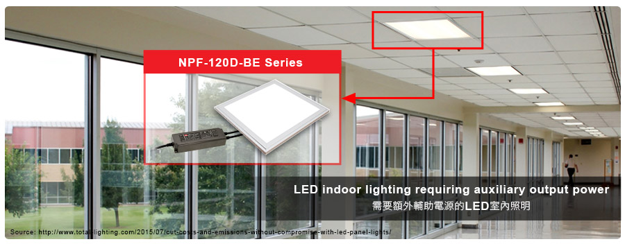 本产品在产品特性上皆与NPF-120D系列相同,提供12V~54V完整的机型数目、PF值>0.9、启动时间<500ms、低空载功耗<0.5W、具有IP67高防护等级、为Type "HL" LED电源。而本次所升级的12V@200mA辅助电源更可作为智慧照明传感器、控制器所需的电源来源,可省去额外配线的困扰,轻松达成智能照明升级,非常适用在搭配有传感器或控制器的平板灯灯具系统、其他需要额外辅助电源的LED室内照明及LED商业照明应用。